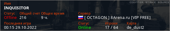 Играет на Counter Strike Source сервере. Страна: РоссияПервый раз замечен 02:00 06.10.2022