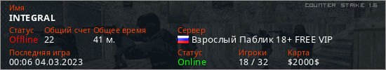Играет на Counter Strike 1.6 сервере. Страна: РоссияПервый раз замечен 18:12 12.11.2021