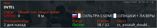 Играет на Counter Strike 1.6 сервере. Страна: РоссияПервый раз замечен 13:12 21.03.2026