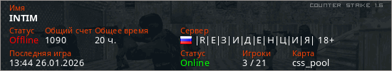 Играет на Counter Strike 1.6 сервере. Страна: РоссияПервый раз замечен 17:36 12.01.2023
