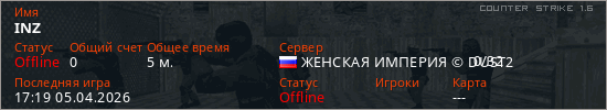 Играет на Counter Strike 1.6 сервере. Страна: РоссияПервый раз замечен 17:11 05.04.2026