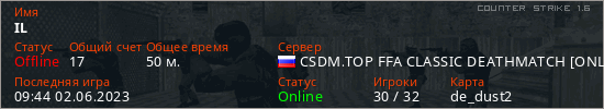 Играет на Counter Strike 1.6 сервере. Страна: РоссияПервый раз замечен 01:03 17.05.2020