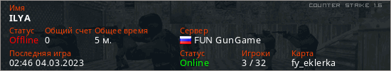 Играет на Counter Strike 1.6 сервере. Страна: РоссияПервый раз замечен 02:44 04.03.2023