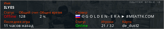 Играет на Counter Strike 1.6 сервере. Страна: РоссияПервый раз замечен 16:09 31.01.2026