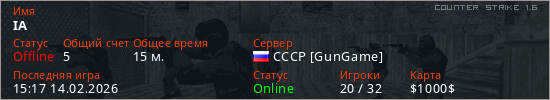 Играет на Counter Strike 1.6 сервере. Страна: РоссияПервый раз замечен 08:51 07.02.2026