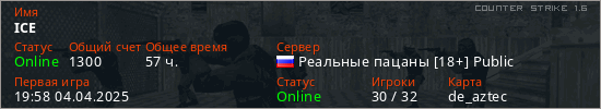 Играет на Counter Strike 1.6 сервере. Страна: РоссияПервый раз замечен 19:58 04.04.2025