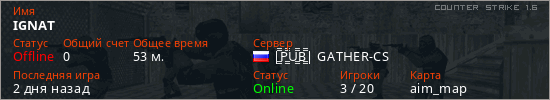 Играет на Counter Strike 1.6 сервере. Страна: РоссияПервый раз замечен 17:25 11.01.2026
