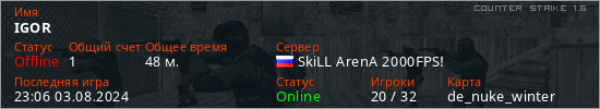 Играет на Counter Strike 1.6 сервере. Страна: РоссияПервый раз замечен 18:31 12.11.2022