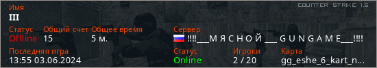 Играет на Counter Strike 1.6 сервере. Страна: РоссияПервый раз замечен 13:46 03.06.2024