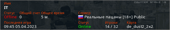 Играет на Counter Strike 1.6 сервере. Страна: РоссияПервый раз замечен 09:35 05.04.2023