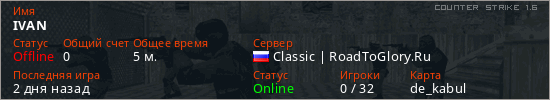 Играет на Counter Strike 1.6 сервере. Страна: РоссияПервый раз замечен 05:50 15.03.2026