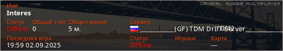 Играет на Criminal Russia Multiplayer сервере. Страна: РоссияПервый раз замечен 19:40 02.09.2025