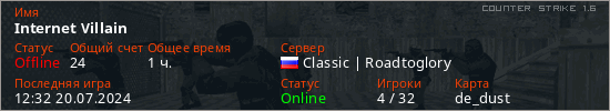 Играет на Counter Strike 1.6 сервере. Страна: РоссияПервый раз замечен 15:23 17.05.2024