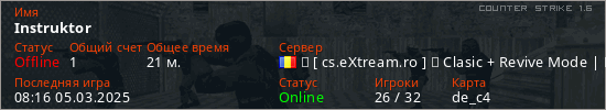 Играет на Counter Strike 1.6 сервере. Страна: РумынияПервый раз замечен 12:03 27.01.2025