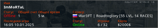Играет на Counter Strike 1.6 сервере. Страна: РоссияПервый раз замечен 15:42 10.01.2025