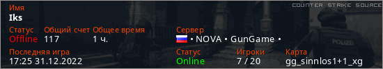 Играет на Counter Strike Source сервере. Страна: РоссияПервый раз замечен 20:44 08.11.2022