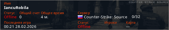 Играет на Counter Strike Source сервере. Страна: РоссияПервый раз замечен 23:37 27.02.2026