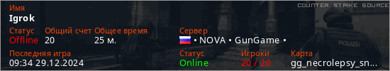 Играет на Counter Strike Source сервере. Страна: РоссияПервый раз замечен 10:39 16.12.2024