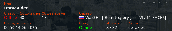 Играет на Counter Strike 1.6 сервере. Страна: РоссияПервый раз замечен 23:59 23.05.2025