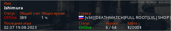 Играет на Counter Strike Source сервере. Страна: РоссияПервый раз замечен 15:33 21.02.2023