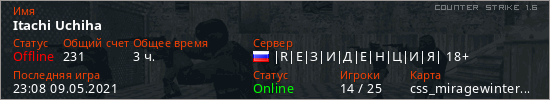 Играет на Counter Strike 1.6 сервере. Страна: РоссияПервый раз замечен 20:58 01.08.2020