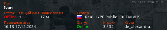 Играет на Counter Strike 1.6 сервере. Страна: РоссияПервый раз замечен 22:19 28.12.2023