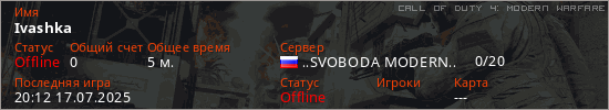 Играет на Call of Duty 4: Modern Warfare сервере. Страна: РоссияПервый раз замечен 19:49 17.07.2025