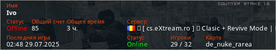 Играет на Counter Strike 1.6 сервере. Страна: РумынияПервый раз замечен 05:33 17.12.2024