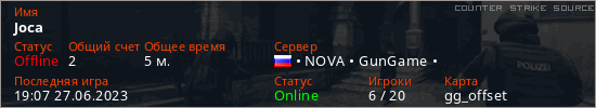 Играет на Counter Strike Source сервере. Страна: РоссияПервый раз замечен 18:51 27.06.2023