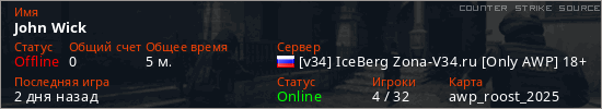 Играет на Counter Strike Source сервере. Страна: РоссияПервый раз замечен 13:22 05.12.2025