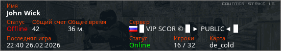 Играет на Counter Strike 1.6 сервере. Страна: РоссияПервый раз замечен 17:08 26.02.2026