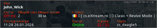 Играет на Counter Strike 1.6 сервере. Страна: РумынияПервый раз замечен 15:51 07.01.2026