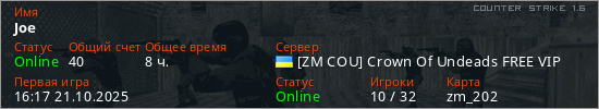 Играет на Counter Strike 1.6 сервере. Страна: УкраинаПервый раз замечен 16:17 21.10.2025