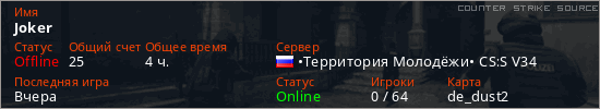 Играет на Counter Strike Source сервере. Страна: РоссияПервый раз замечен 19:08 16.12.2025