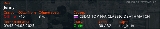 Играет на Counter Strike 1.6 сервере. Страна: РоссияПервый раз замечен 17:22 19.10.2020