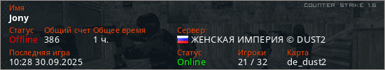 Играет на Counter Strike 1.6 сервере. Страна: РоссияПервый раз замечен 12:02 30.01.2022