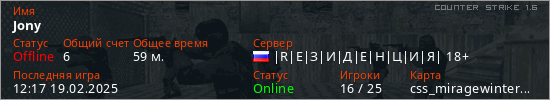 Последний раз был в сети 12:17 19.02.2025 Игрок с таким ником замечен на 34 серверах