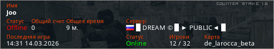 Играет на Counter Strike 1.6 сервере. Страна: РоссияПервый раз замечен 11:36 14.03.2026