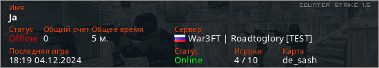 Играет на Counter Strike 1.6 сервере. Страна: РоссияПервый раз замечен 18:12 04.12.2024