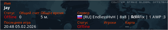Играет на Counter Strike Global Offensive сервере. Страна: РоссияПервый раз замечен 20:34 05.02.2026