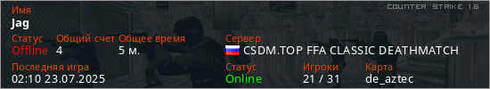 Играет на Counter Strike 1.6 сервере. Страна: РоссияПервый раз замечен 02:07 23.07.2025