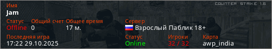 Играет на Counter Strike 1.6 сервере. Страна: РоссияПервый раз замечен 12:44 28.09.2025