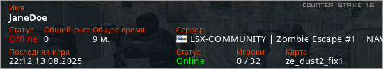 Играет на Counter Strike 1.6 сервере. Страна: СШАПервый раз замечен 04:39 13.08.2025