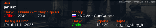 Играет на Counter Strike Source сервере. Страна: РоссияПервый раз замечен 12:32 08.10.2023