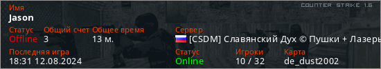 Играет на Counter Strike 1.6 сервере. Страна: РоссияПервый раз замечен 21:24 03.03.2024