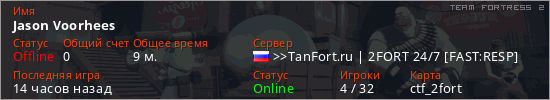 Играет на Team Fortress 2 сервере. Страна: РоссияПервый раз замечен 11:07 21.04.2026