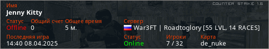 Играет на Counter Strike 1.6 сервере. Страна: РоссияПервый раз замечен 14:38 08.04.2025