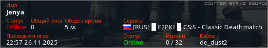 Играет на Counter Strike Source сервере. Страна: РоссияПервый раз замечен 22:55 26.11.2025