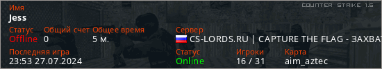 Играет на Counter Strike 1.6 сервере. Страна: РоссияПервый раз замечен 23:49 27.07.2024