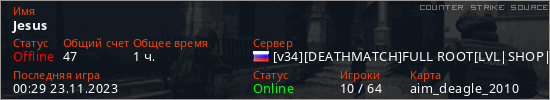 Играет на Counter Strike Source сервере. Страна: РоссияПервый раз замечен 21:02 16.01.2023